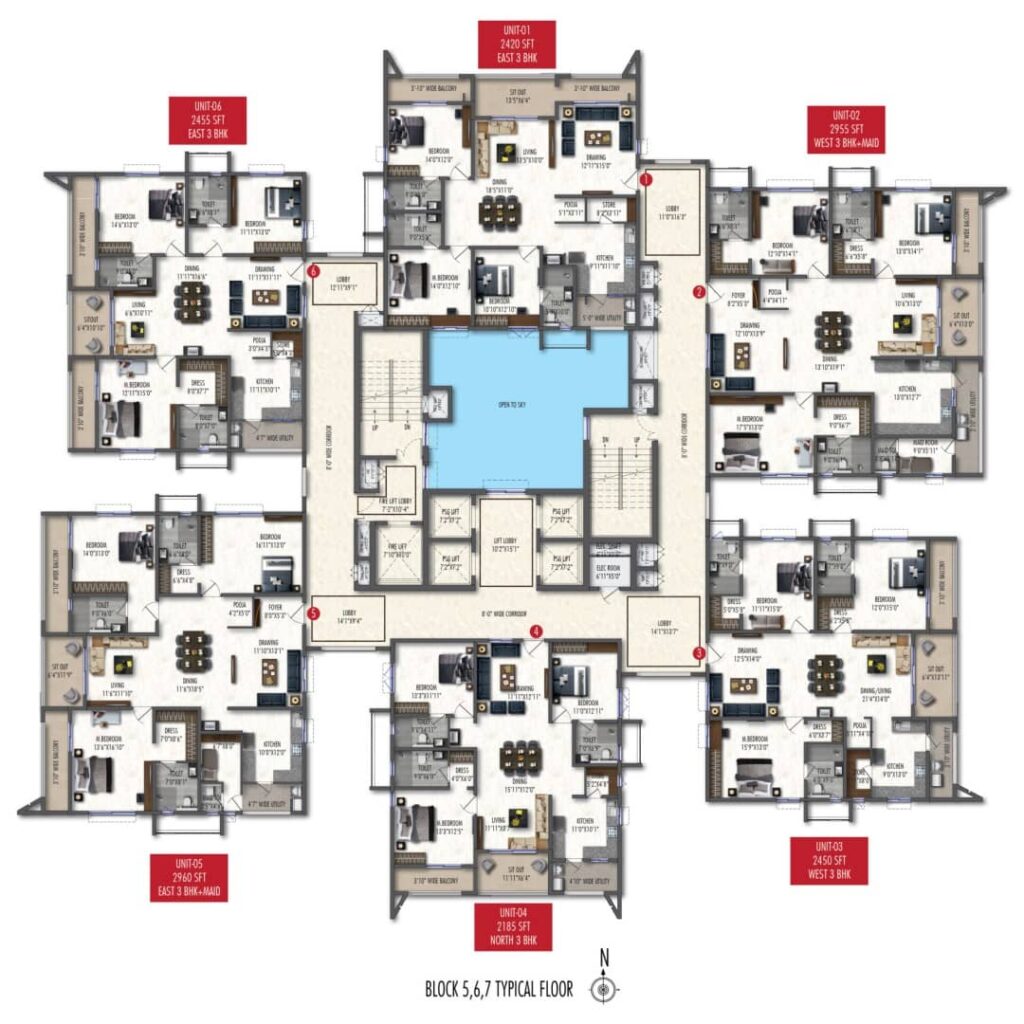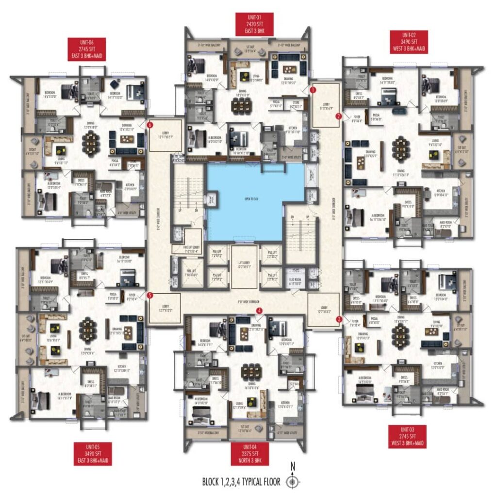 The 3 BHK apartments range from 2,185 square feet to 3,490 square feet, providing flexible layouts to suit both compact and large family needs.
